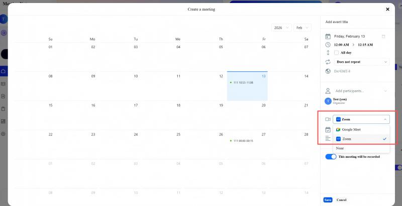 Then, in the newly appeared Create Meeting pop-up window, select the time, enter the meeting name, and choose to create the meeting from Zoom.