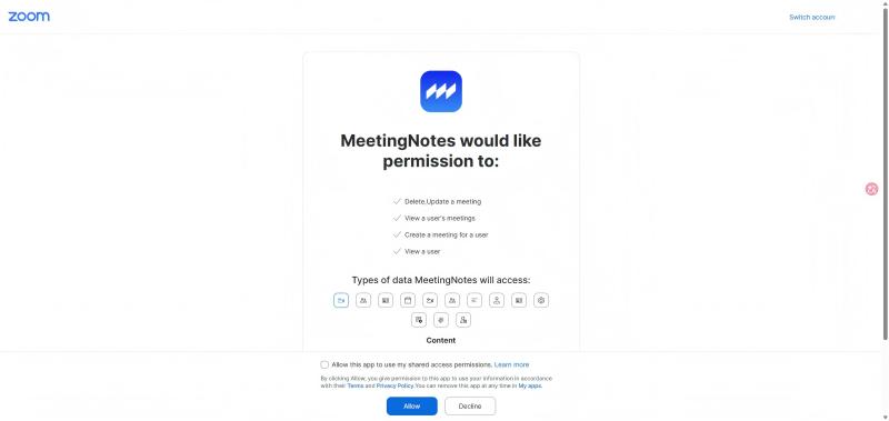 MeetingNotes will then display information requiring your authorization; click the Agree button. Finally, you will be redirected back to MeetingNotes, and Zoom will have successfully connected.