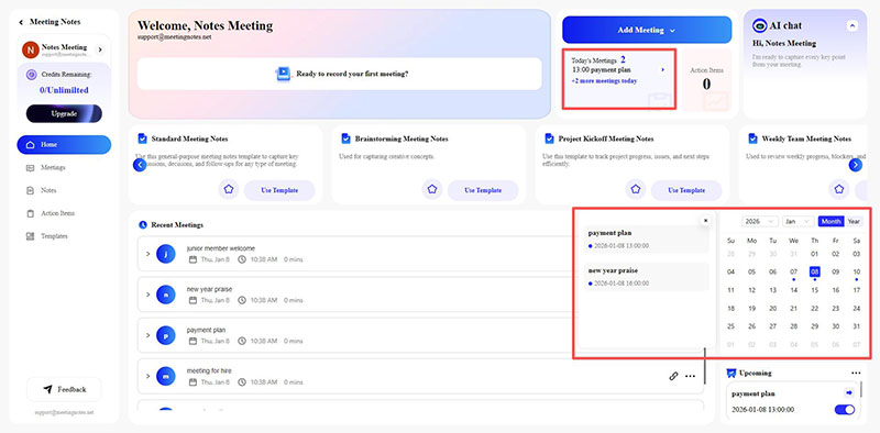 Finally, the page will automatically redirect back to the MeetingNotes. At this point, your meeting schedule for today will be displayed under Today's Meetings. Dates with scheduled meetings in the calendar will be marked with a blue dot. Click on the corresponding date to view the detailed schedule.
