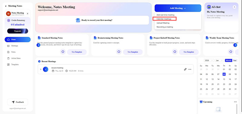 Meeting NotesOn the control panel, click the "Add Meeting" button and select "Calendar Meetings" from the drop-down menu.