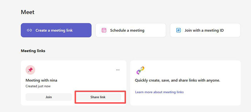 Alternatively, after successfully creating a meeting, you can click the Share link button provided by the meeting below the Create a meeting link button.