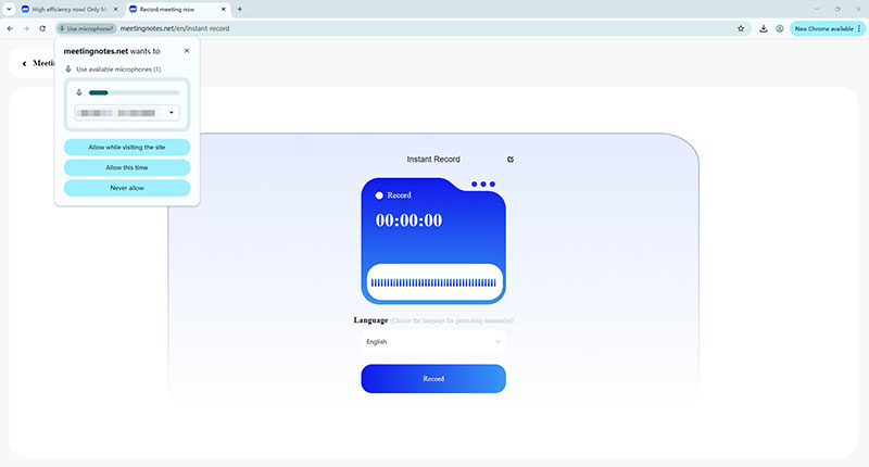 Then click the "Record" button to allow MeetingNotes to use the microphone.