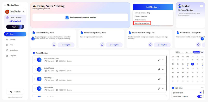Meeting NotesOn your control panel, click the Add Meeting button and select Recording a meeting from the drop-down menu.