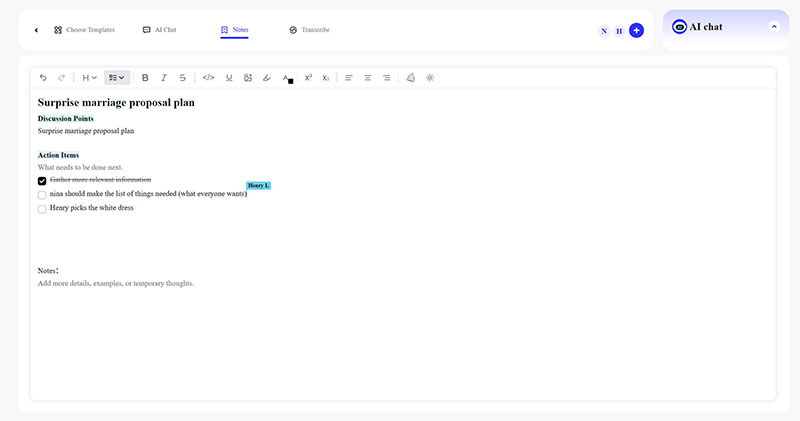 In fact, The Notes are not just view-only records, but truly real-time, collaborative meeting notes that multiple people can edit. As long as you have access to the Notes, you can edit them.